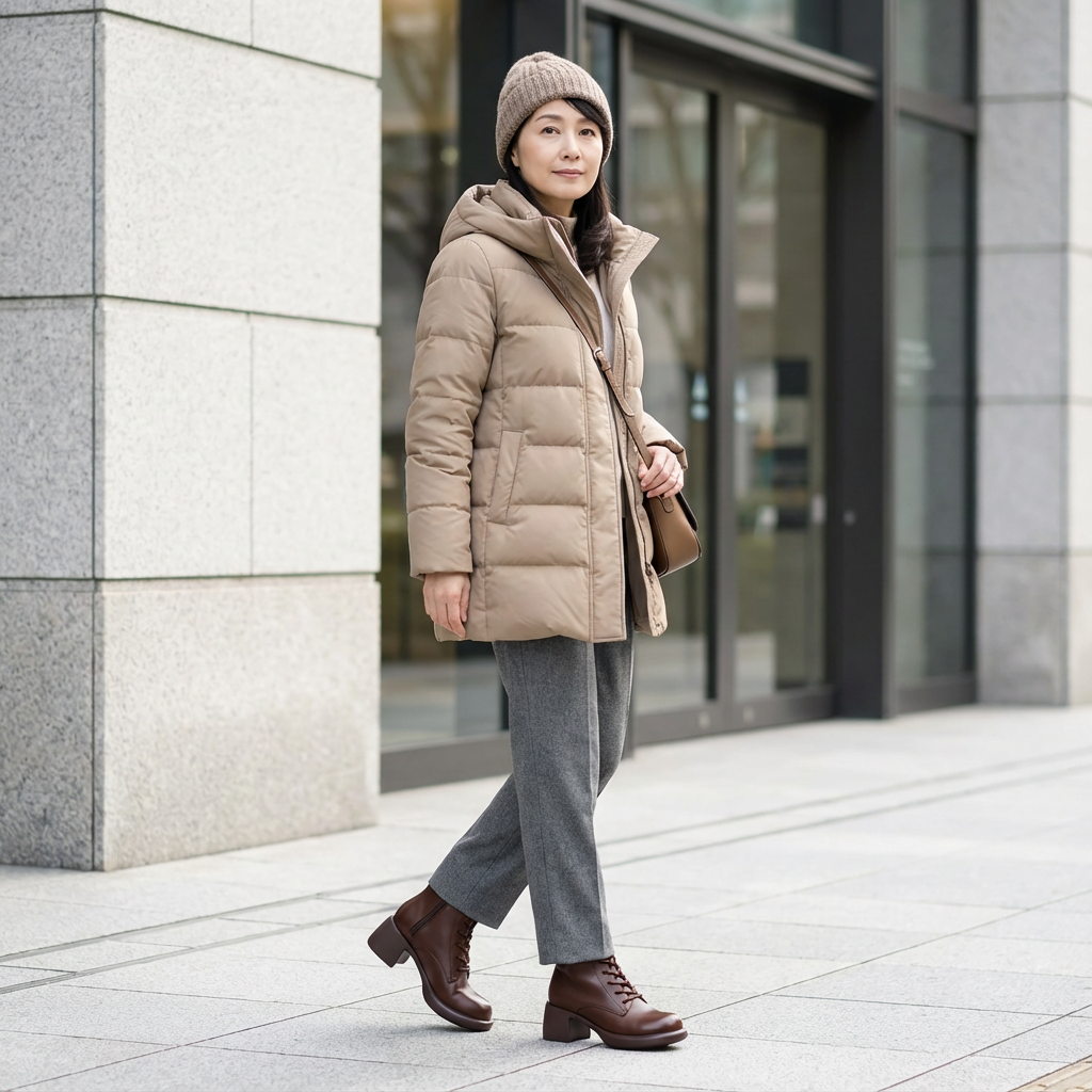 朝、このブーツを履くだけで脚がすらりと長く見え、姿勢も自然と整い、全体のシルエットがより美しく引き立ちます。