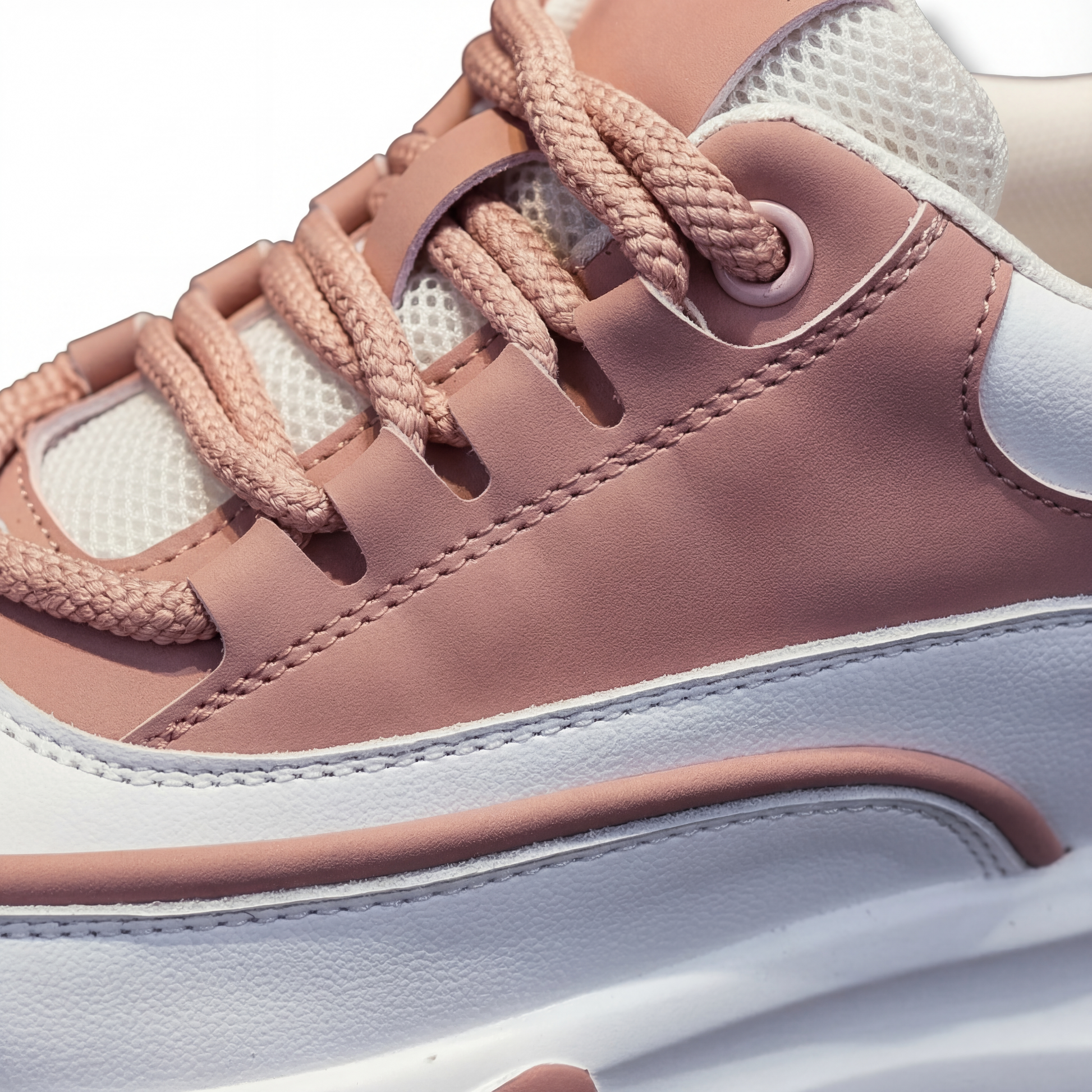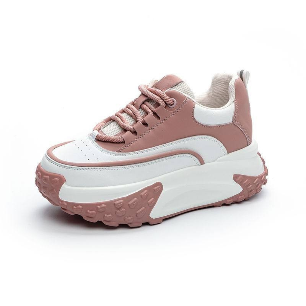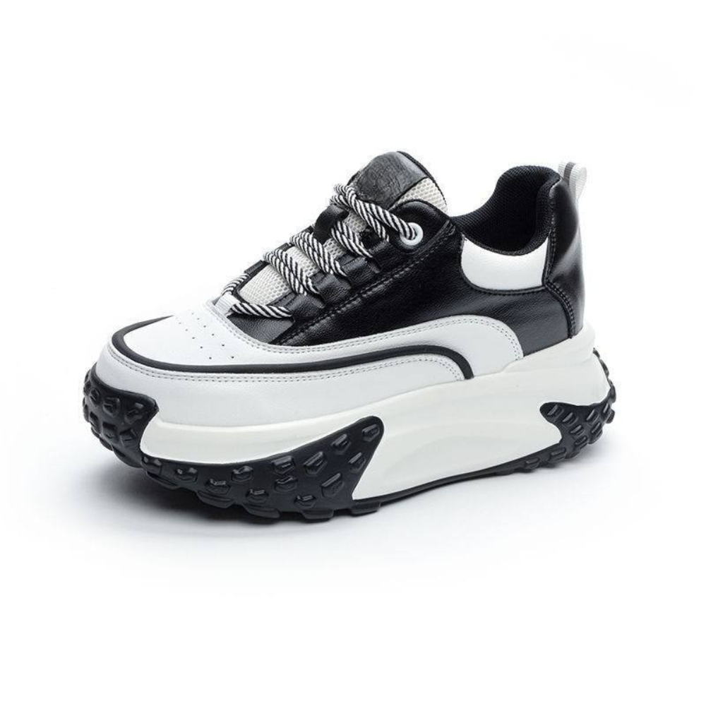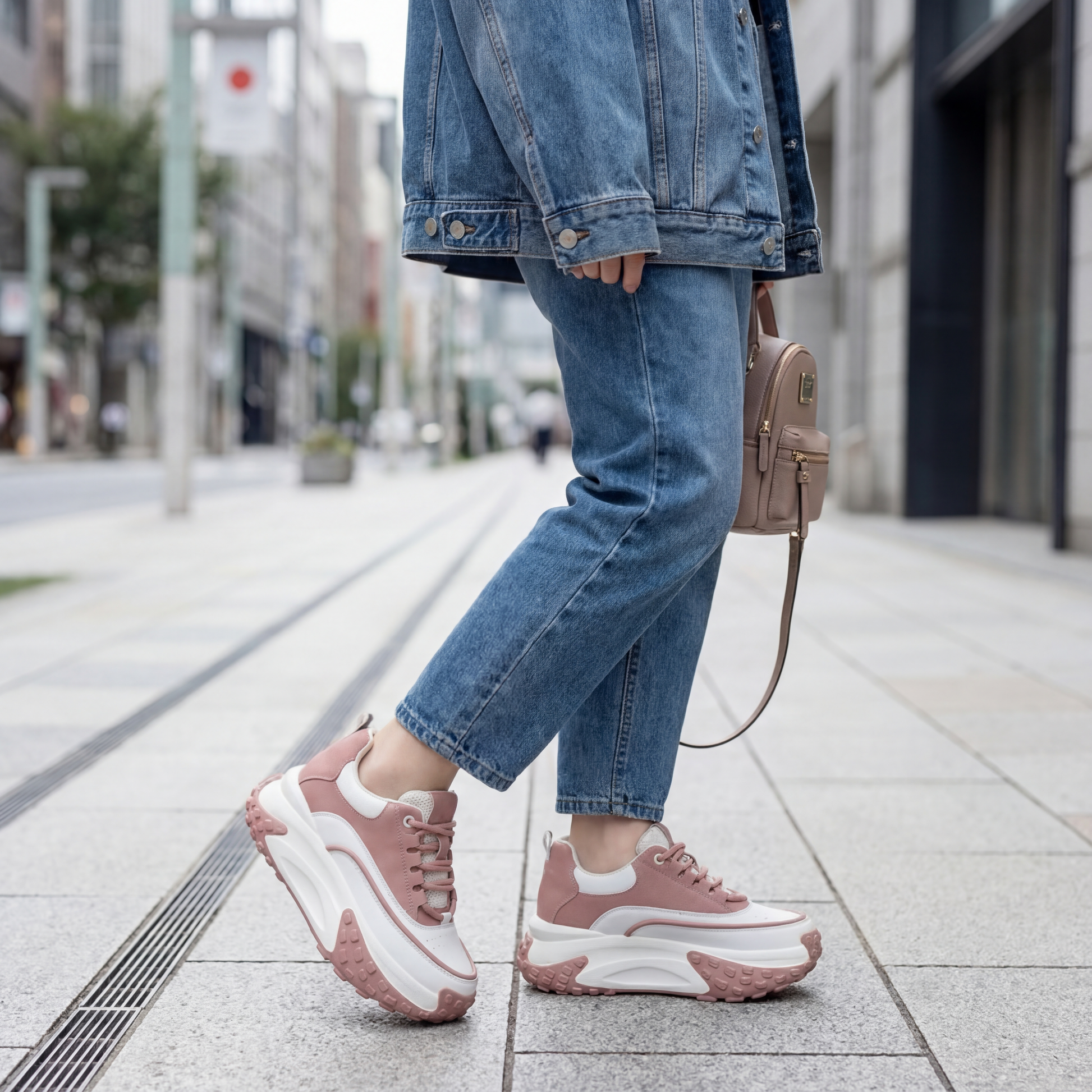 このスニーカーは標準的なフィット感で 5cmのプラットフォームソールが快適な履き心地を提供します。つま先部分にゆとりがあり、長時間の着用でも窮屈感がありません。