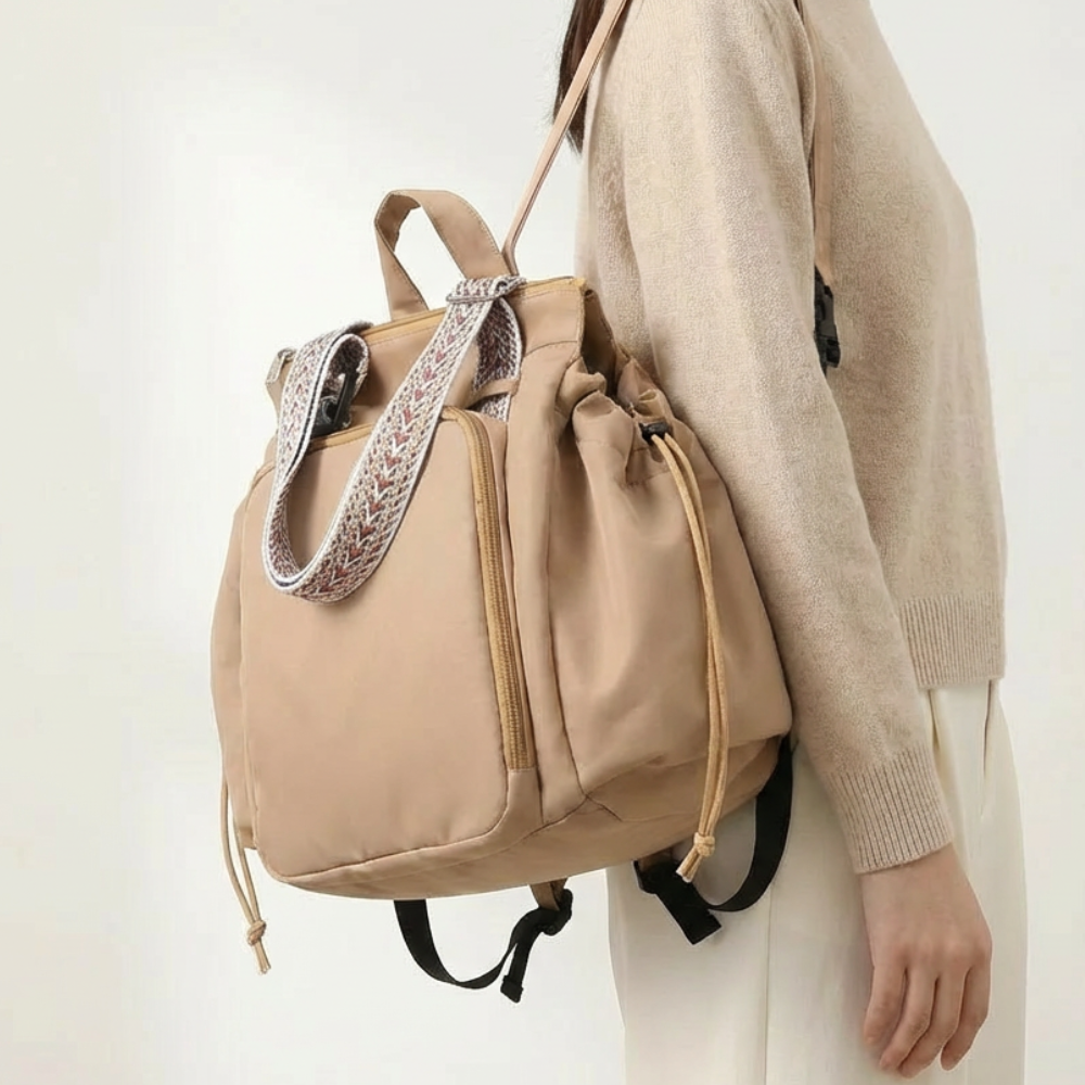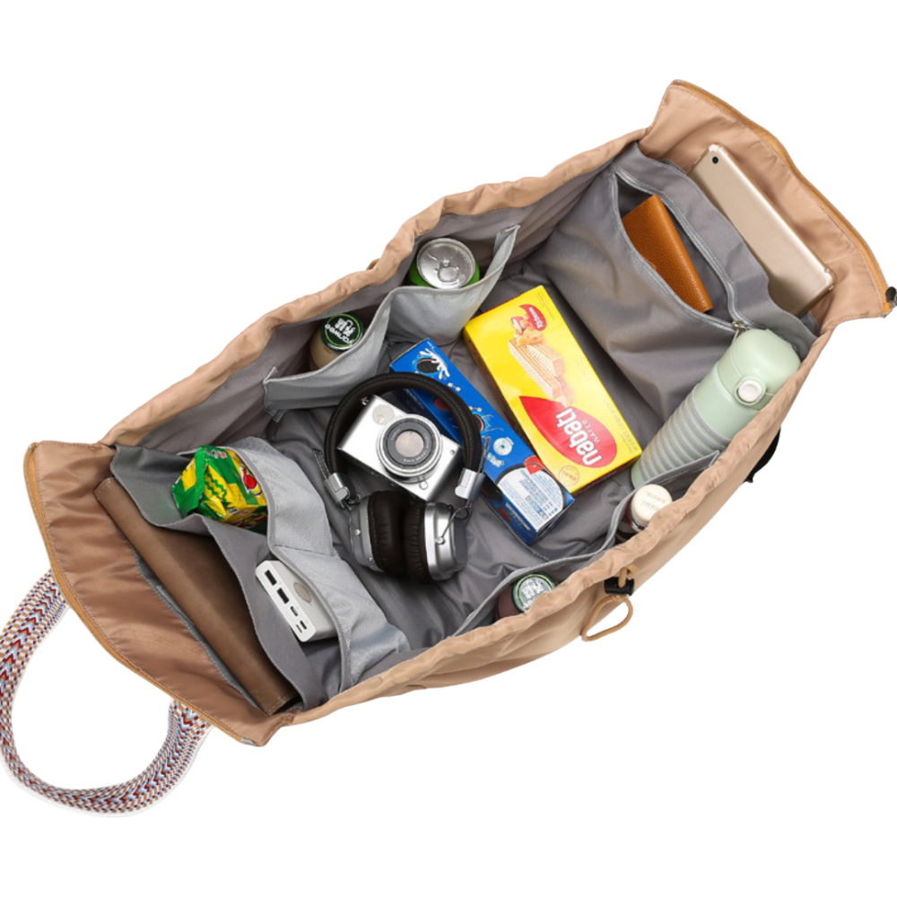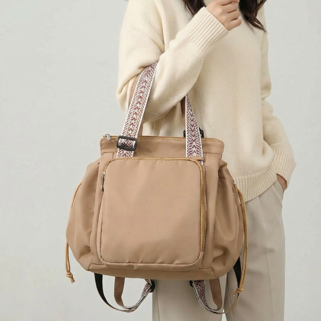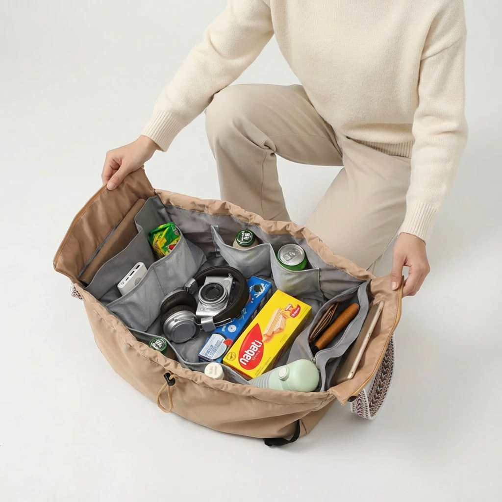おしゃれなショルダーバッグに折りたたみ可能。着替え・スマホ・おむつ類もまるごと収納できて、移動もスマート。