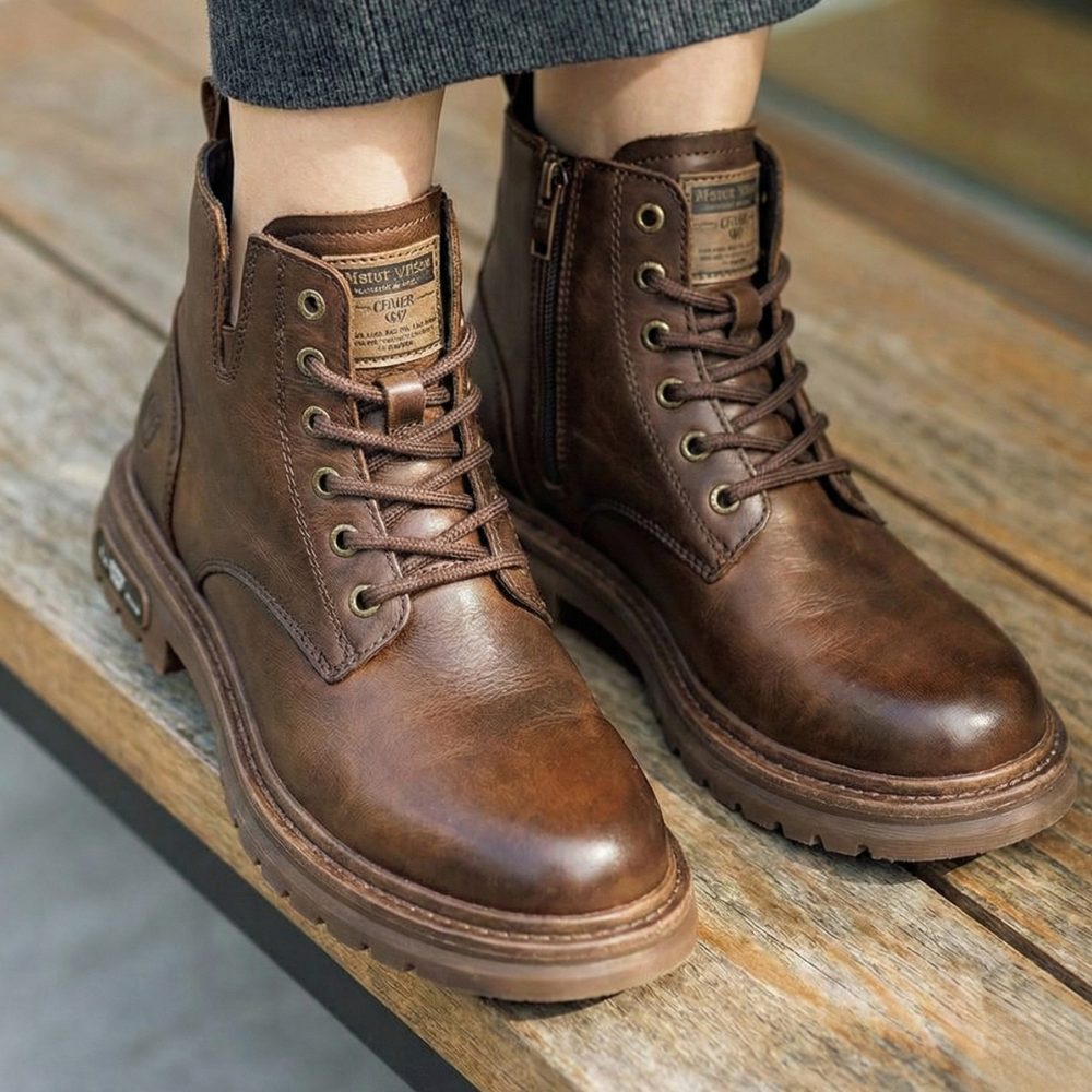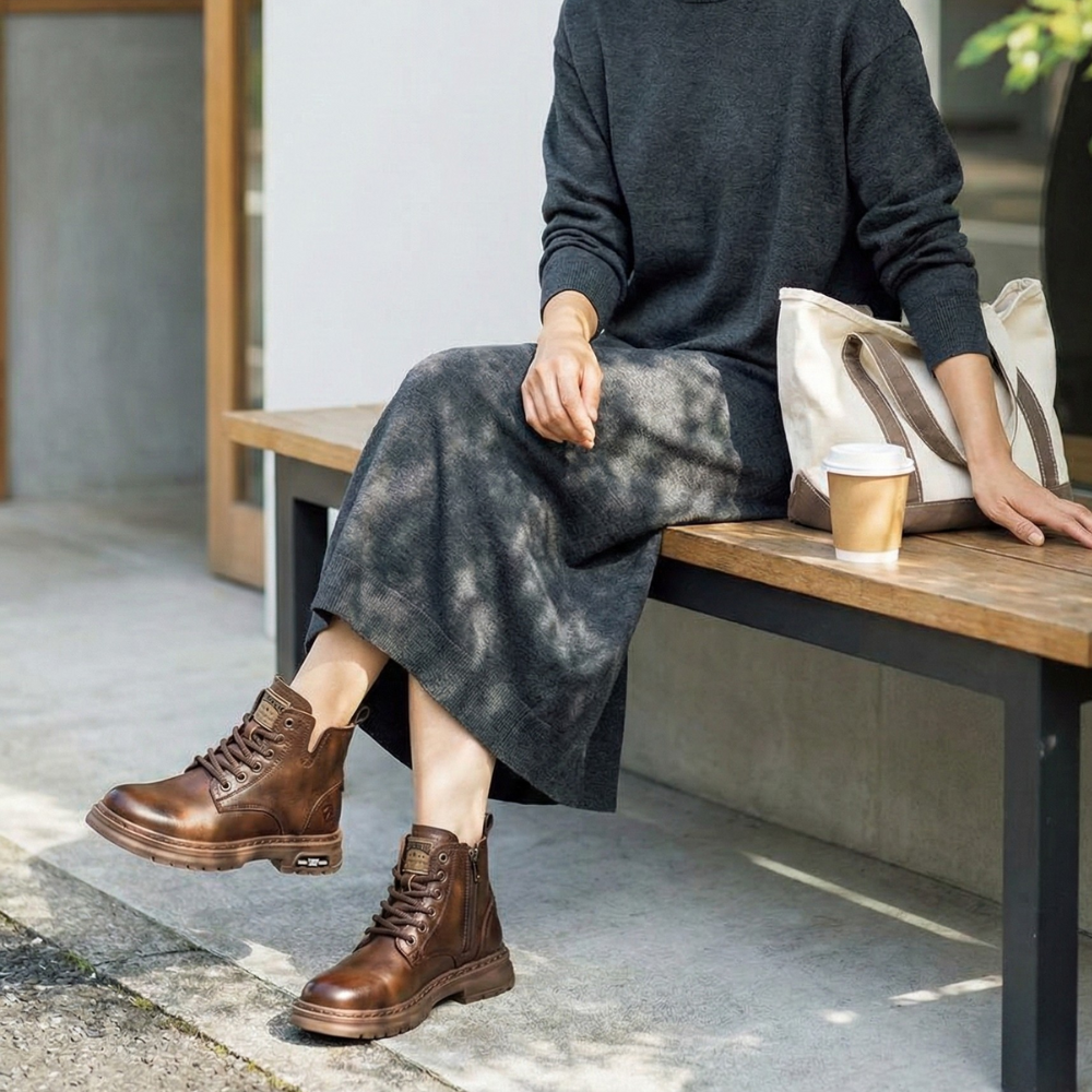 飽きのこないワークブーツシルエットで、パンツスタイルやジャケット、デニム、ワンピースなど、さまざまな装いに自然と馴染みます。