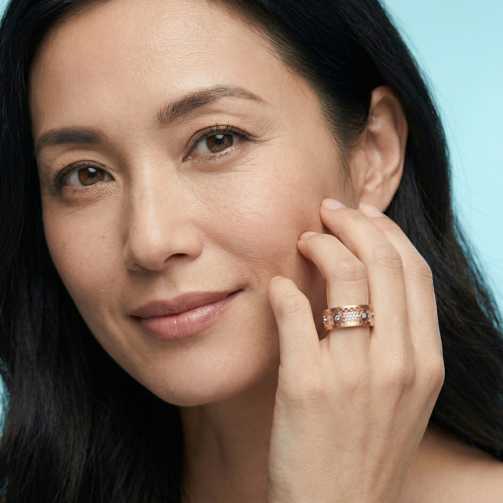 日常使いもおすすめですが、手洗いやスキンケアの際は外していただくことで、より美しい輝きを長くご愛用いただけます。