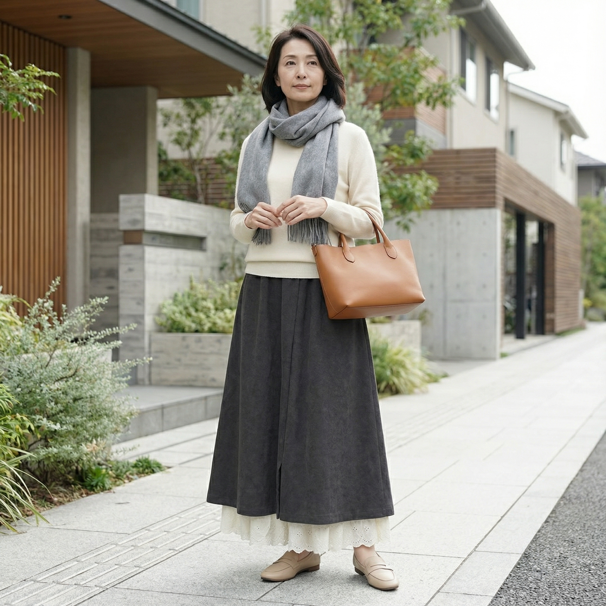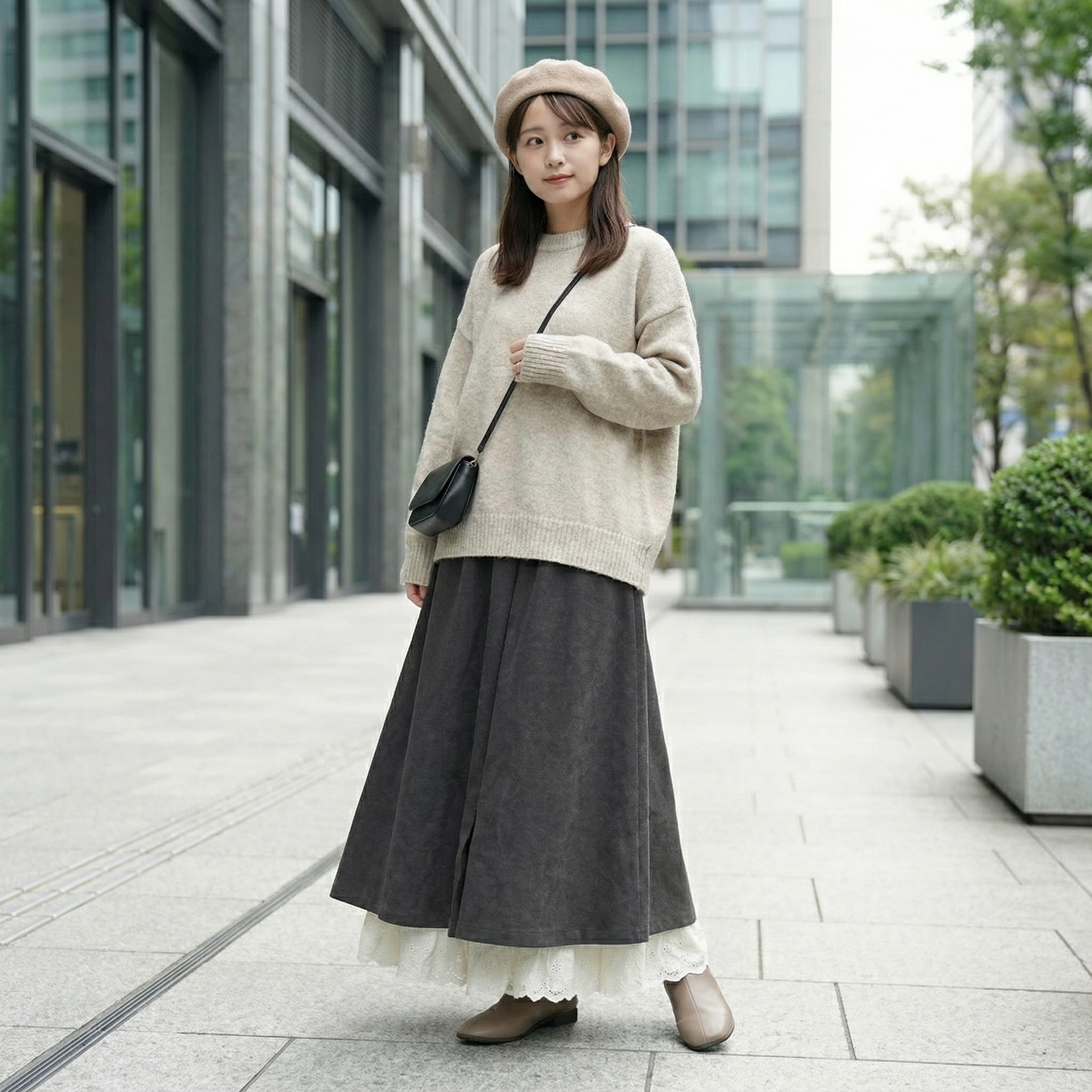 - スカートの下での快適な重ね着のために、ワンサイズアップをおすすめします