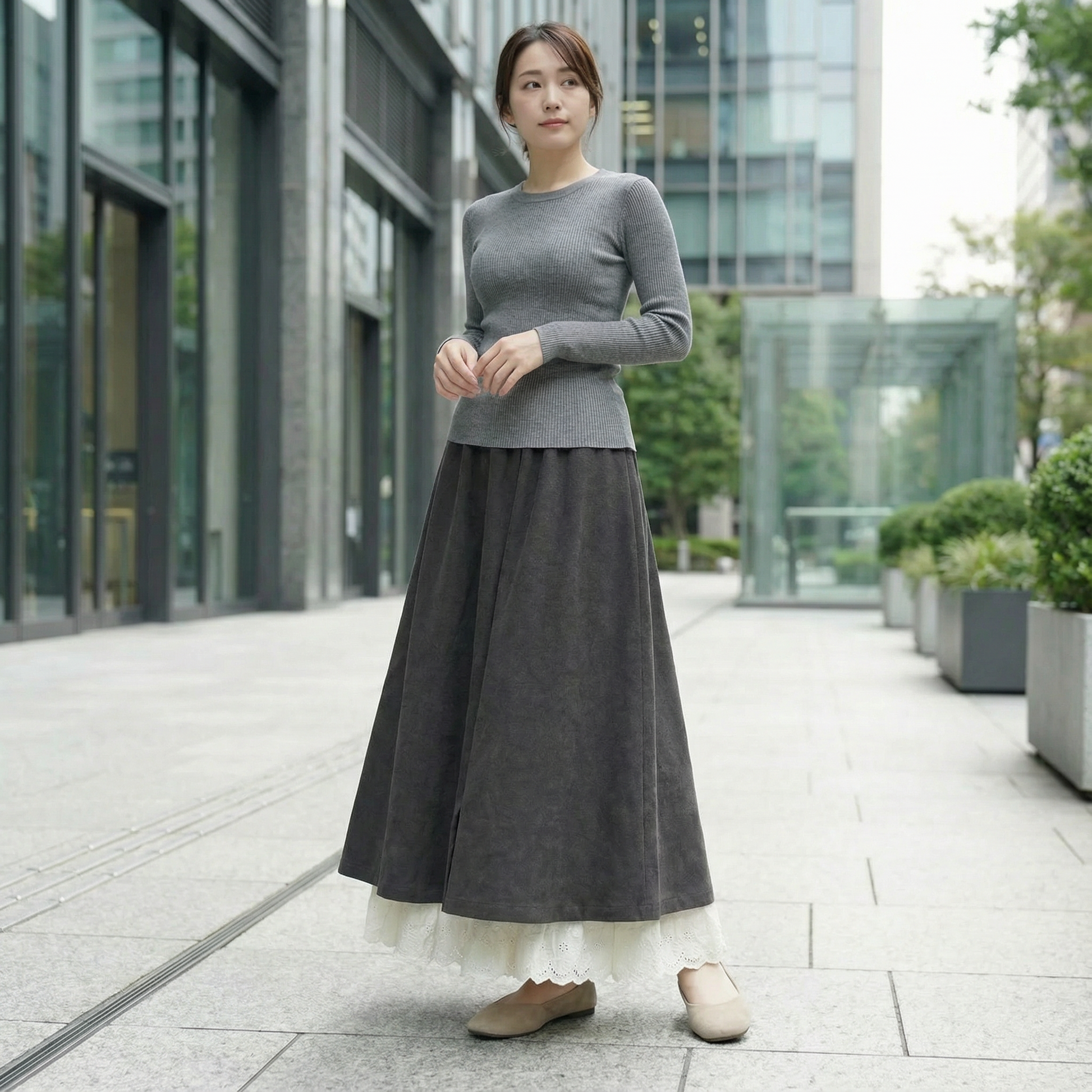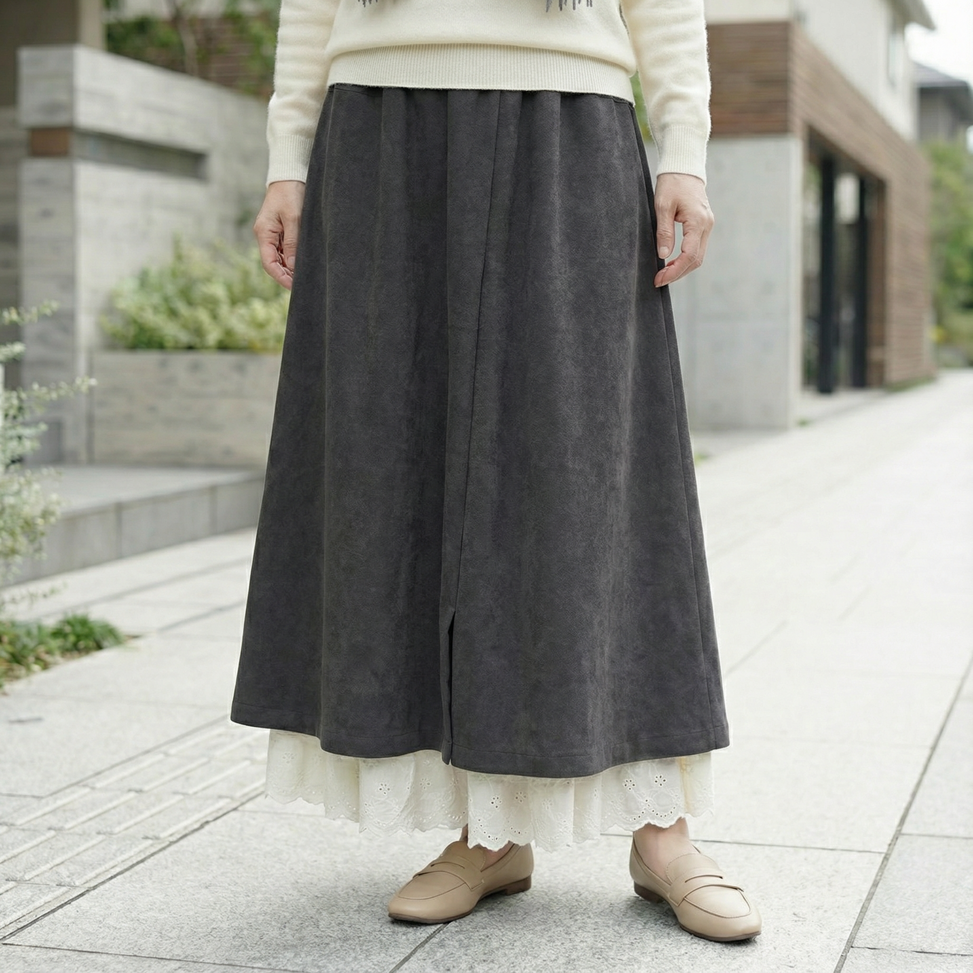 裾のレースがふんわりと見え、シンプルなコーディネートも重ね着風のおしゃれに。お出かけやお仕事など、幅広いシーンで活躍します。