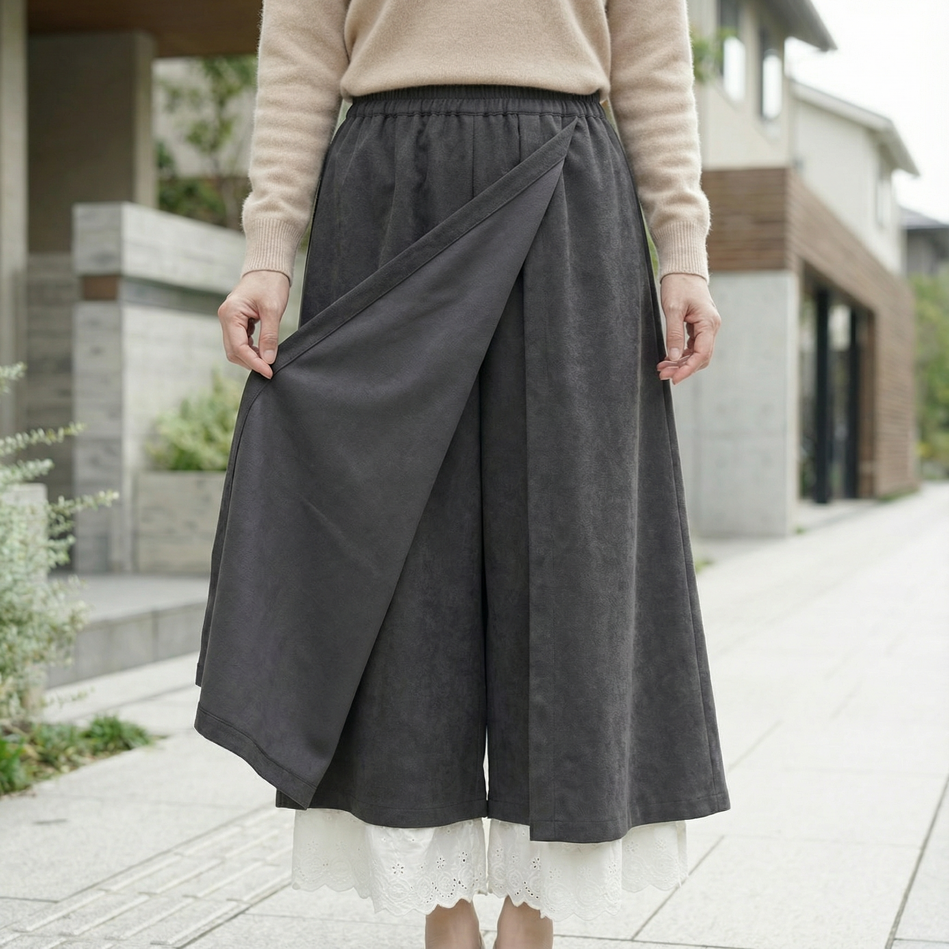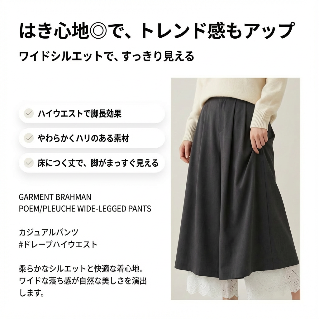着用感 スカートの下に重ね着するためのワイドレッグパンツで、ゆったりとした着心地が特徴です。ハイウエストデザインで美しいシルエットを作り出します。