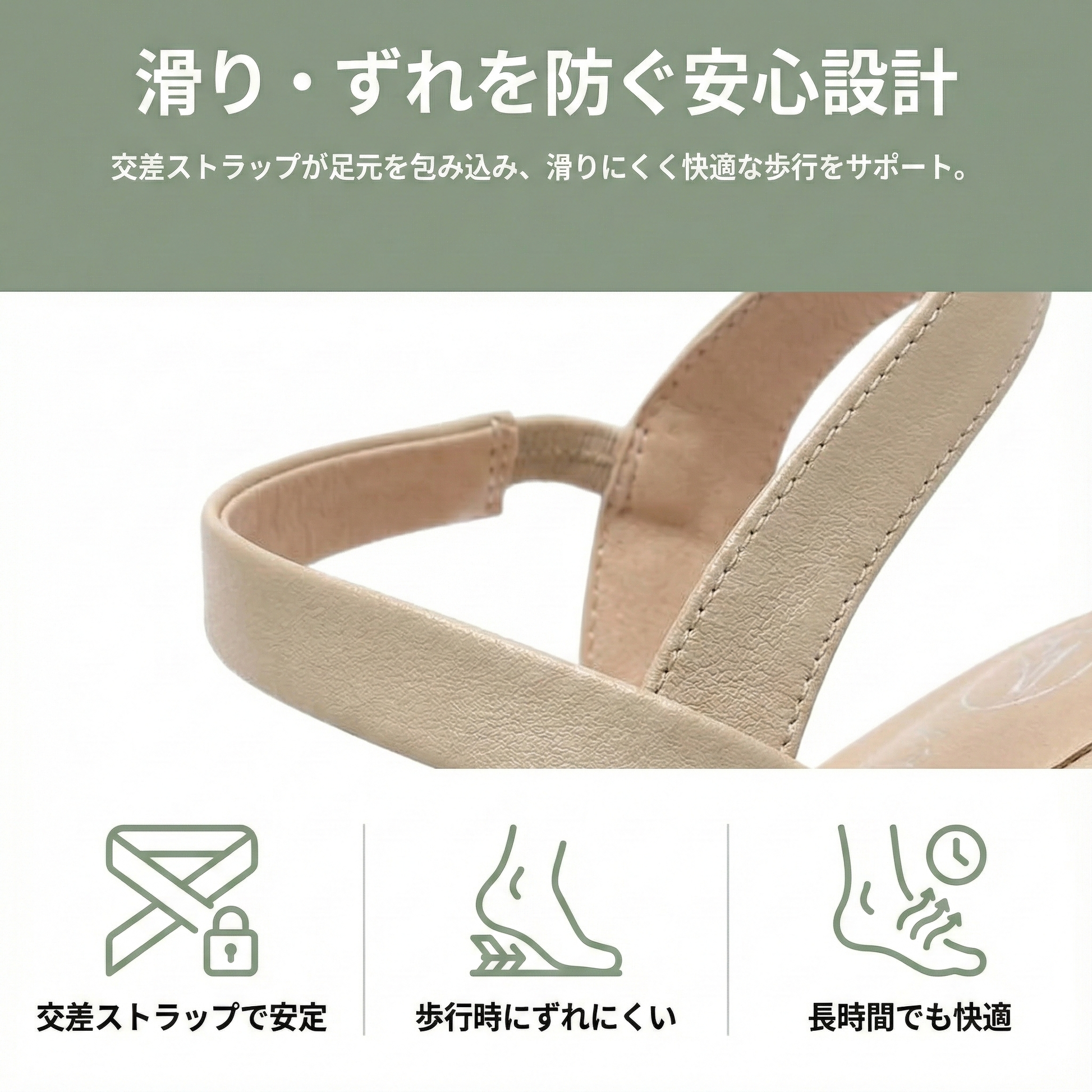 その秘密は、足元をやさしく包み込むクロスストラップのデザインと、人間工学に基づいた6cmヒール。美しい高さと快適な履き心地を両立し、「おしゃれ」と「快適さ」をどちらも叶えます。
