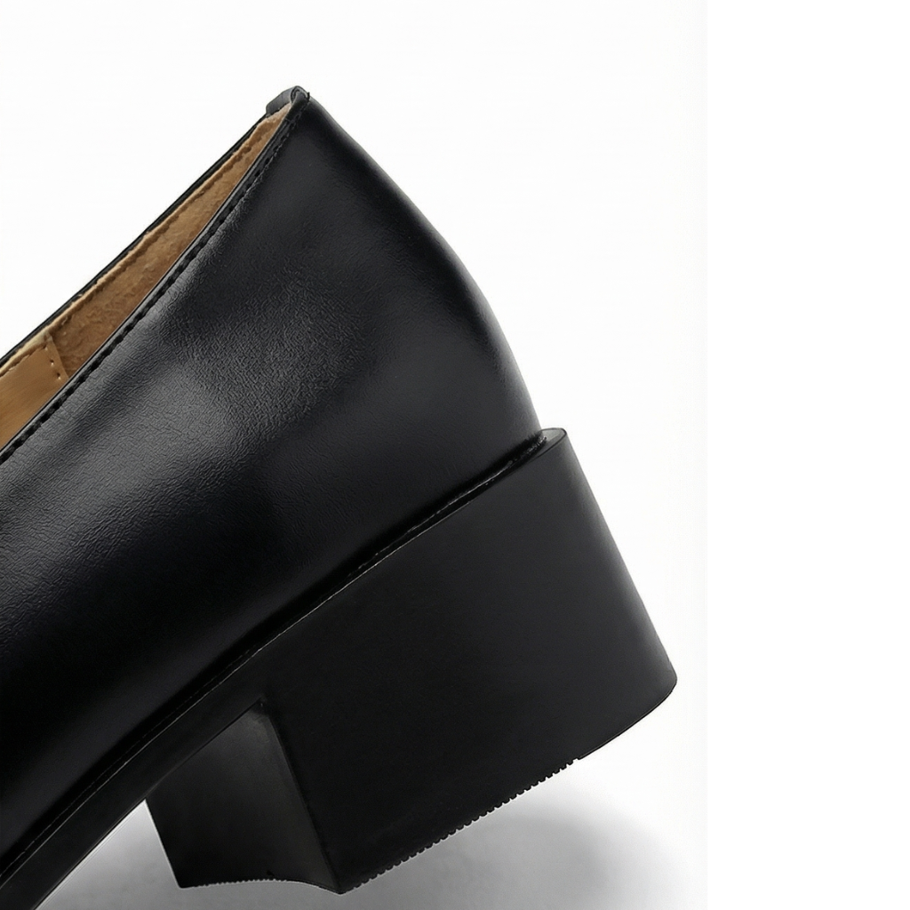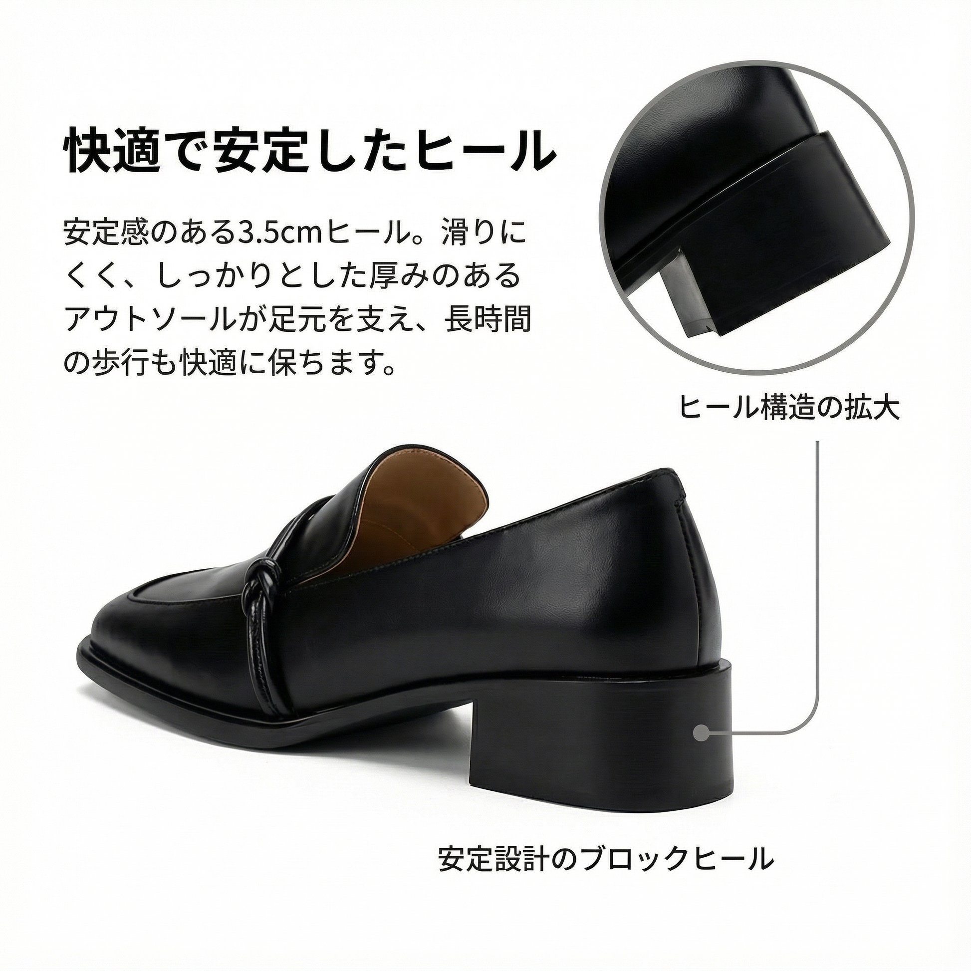 フィット感 これらのローファーは、洗練されたスクエアトゥデザインでプロフェッショナルな仕立ての良いフィット感を特徴としています。4E幅広設計により、足の前部分にゆとりを持たせながらもエレガントなシルエットを保ちます。3.5cmのブロックヒールは、安定したサポートとともに上品な高さを提供します。