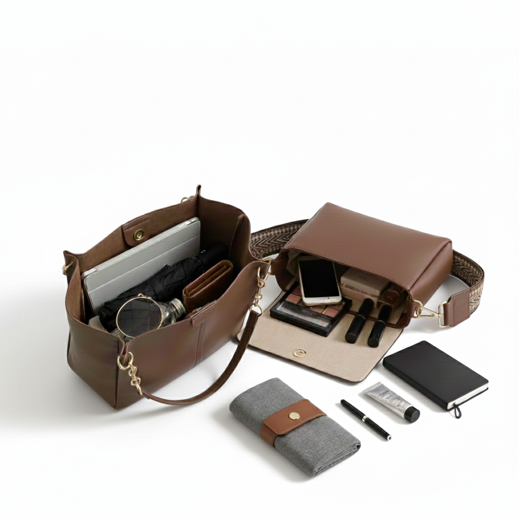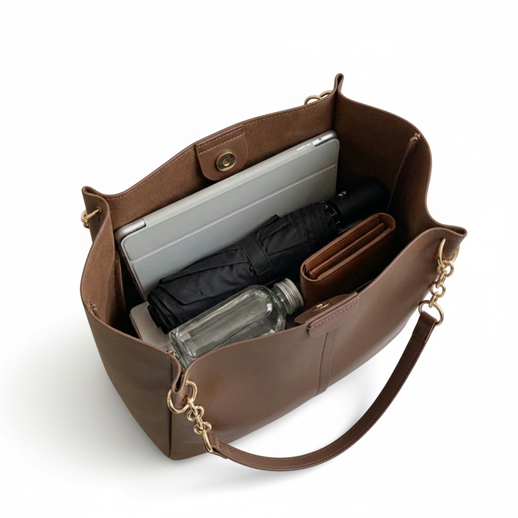 「どのバッグと合わせよう?」と悩む必要はありません。トートとショルダーはセットでも、単品でも活躍します。気分や予定に合わせて持ち替えるだけで、装いに洗練された印象が加わります。