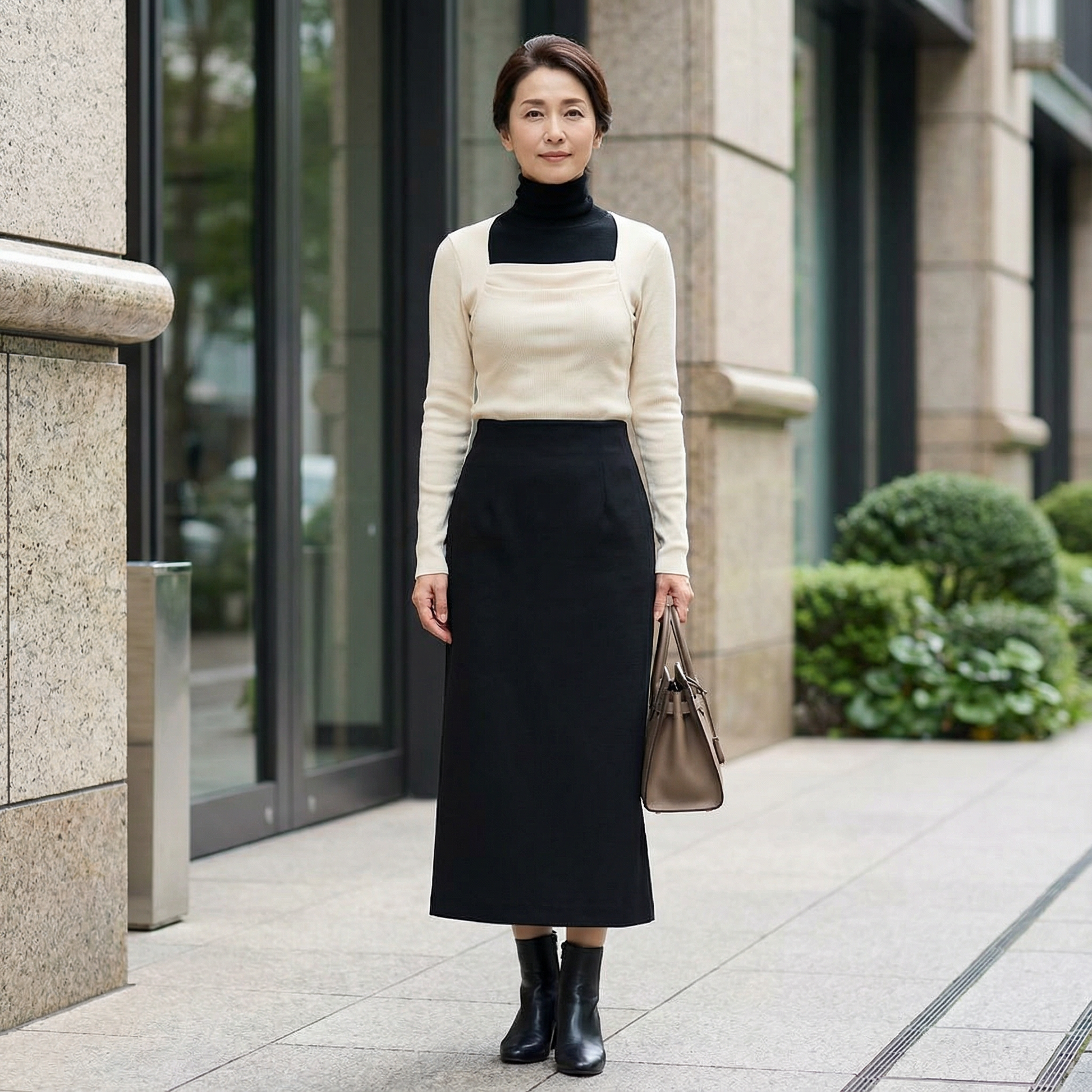 ほどよい着圧でラインを整え、重ね着の下でも自信の持てる美しいシルエットが続きます。
