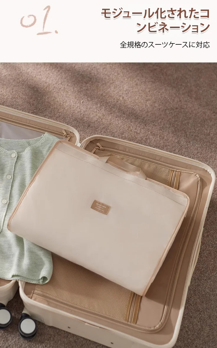 このバッグがあれば、そんな心配も解消。7つの専用ポケットでアイテムごとにスマートに整理でき、パッキングの手間も大幅に軽減されます。心にゆとりを持って、旅の始まりを迎えられます。