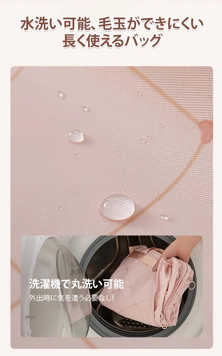 やわらかな撥水生地を採用し、50回以上のお洗濯でも型くずれしにくい仕様です。日々の汚れや水ぬれから大切な荷物をしっかり守ります。