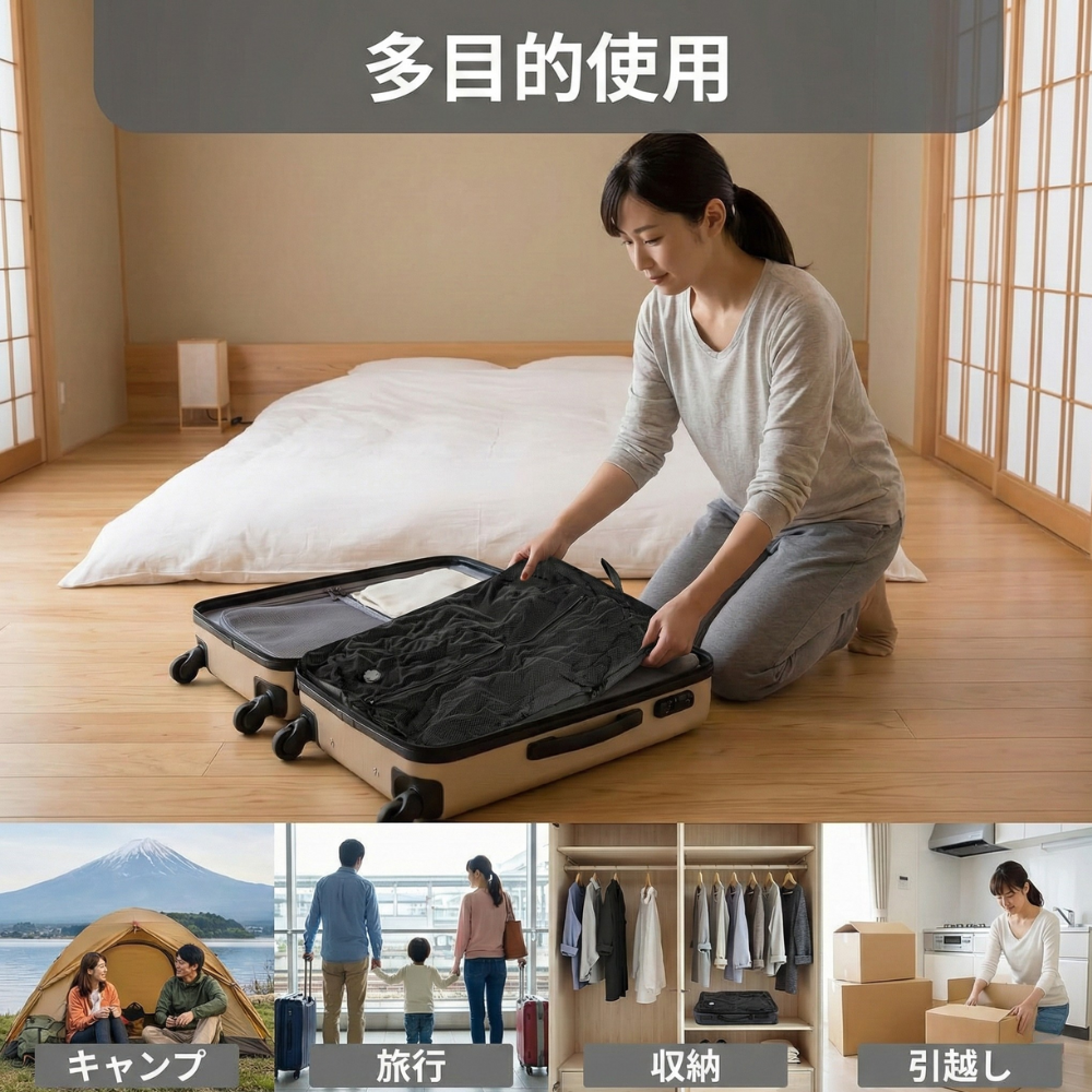 最大約70%のスペースを節約できるため、お土産やお気に入りのアイテムもすっきり収納。大切な衣類やコスメも湿気や水濡れからしっかり守ります。