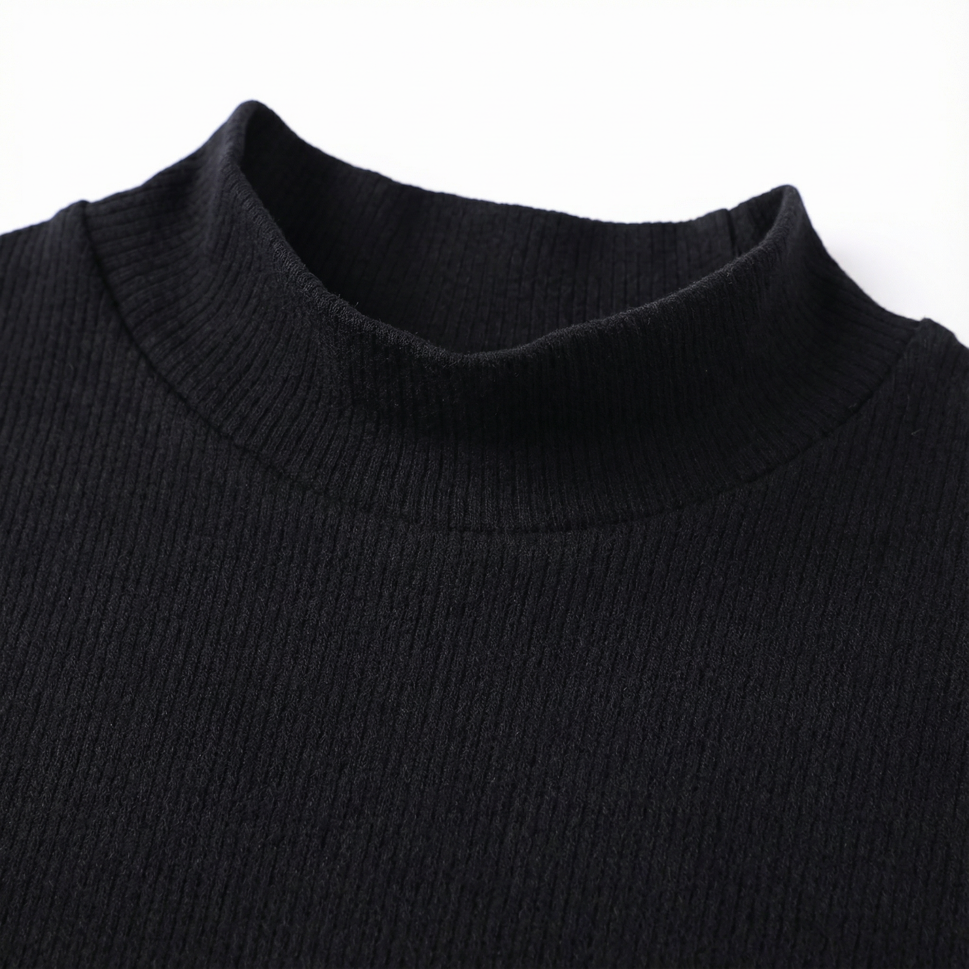 リブ仕様のタートルネックは適度な伸縮性があり、首元にもやさしくフィットします。締め付け感もなく快適な着用感です。