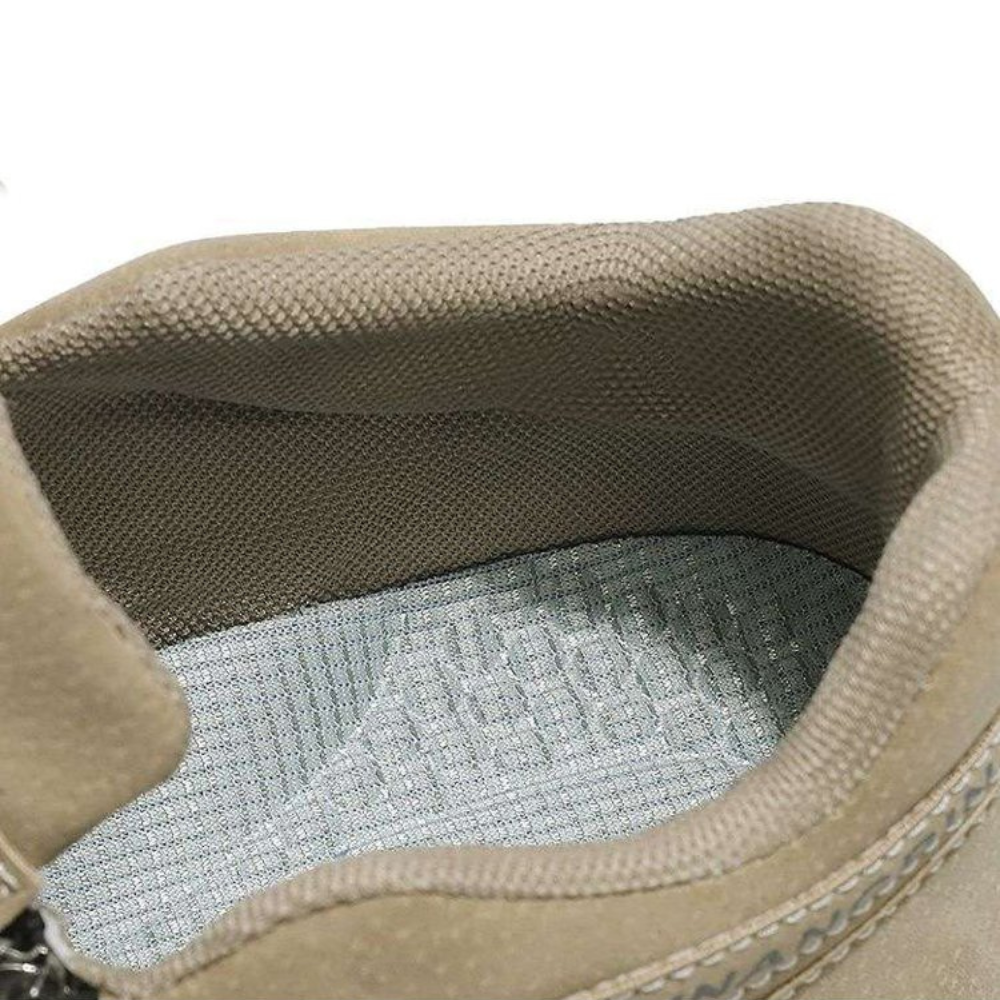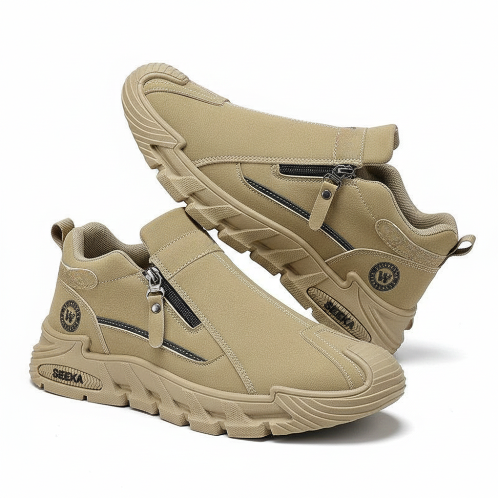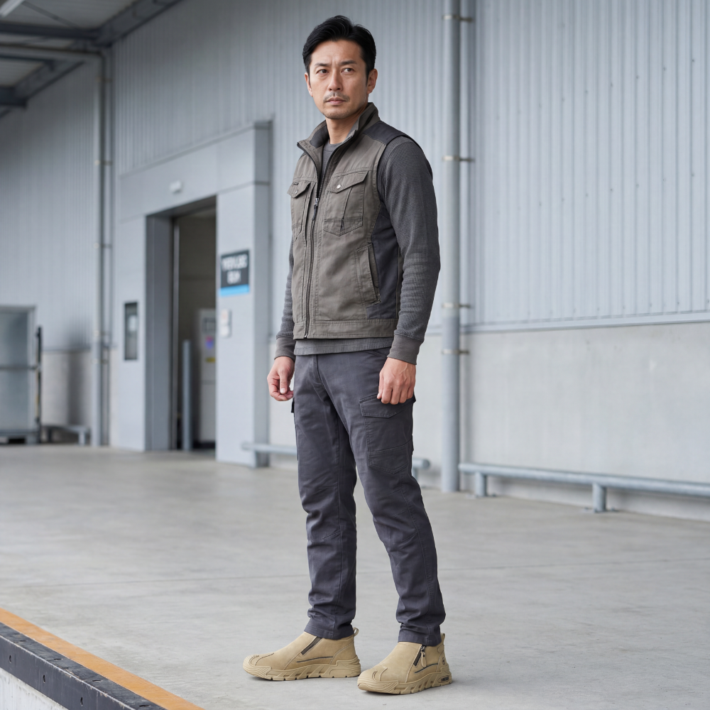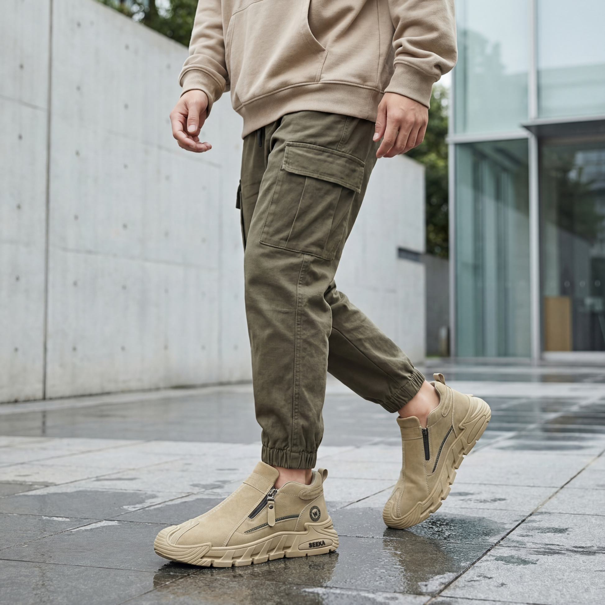 - 素材:防水合成アッパー、通気メッシュパネル、衝撃吸収ラバーソール、前面ジッパー仕様