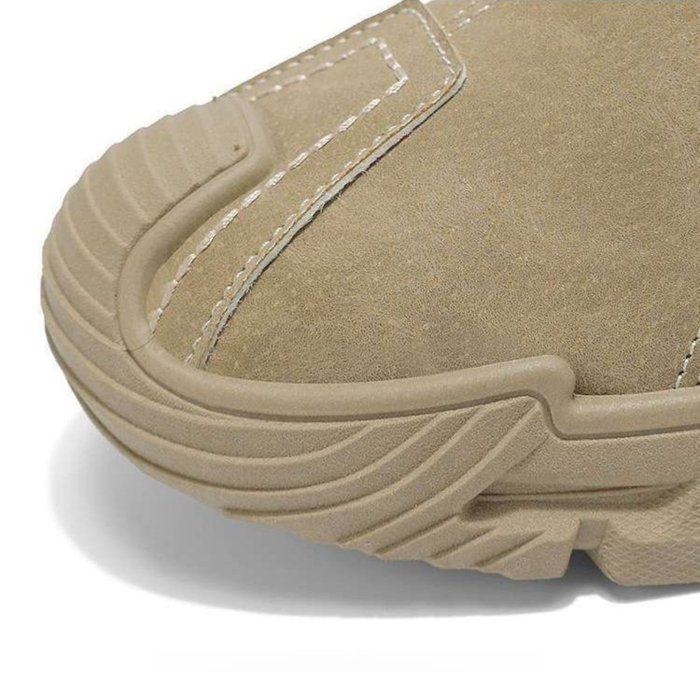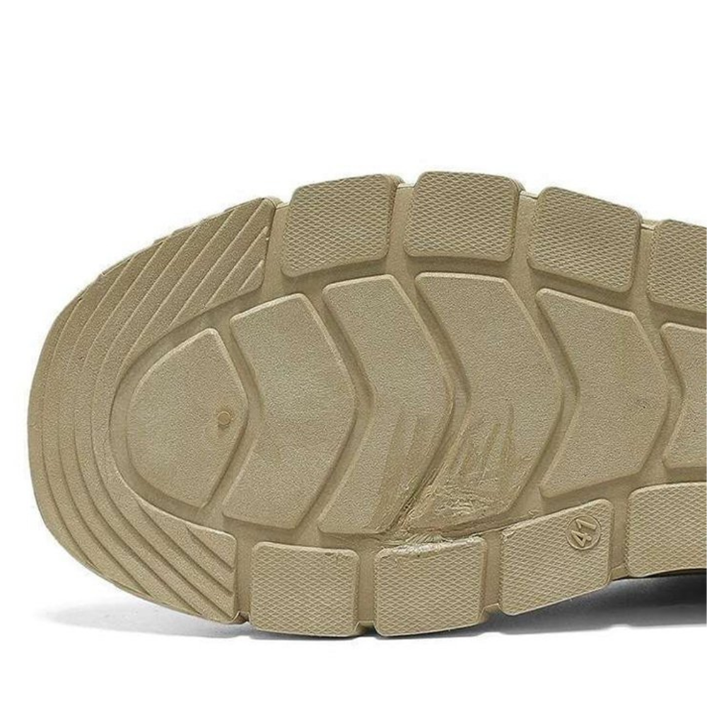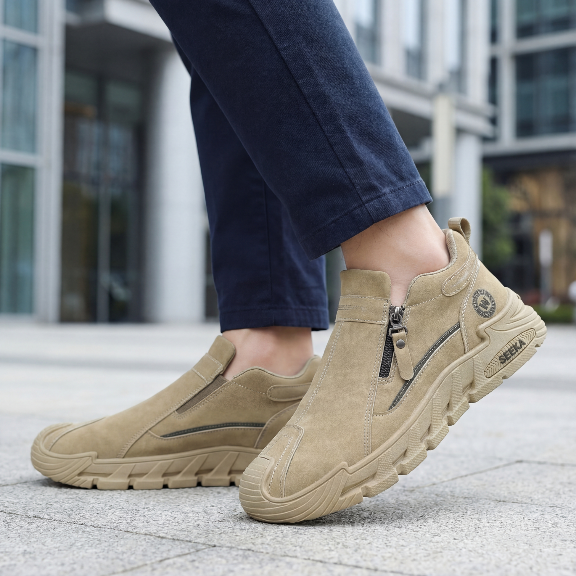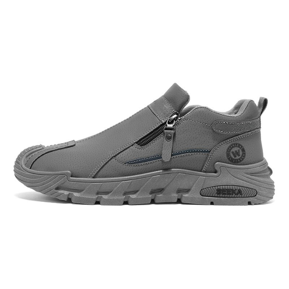 - 素材:防水合成アッパー、通気メッシュパネル、衝撃吸収ラバーソール、前面ジッパー仕様