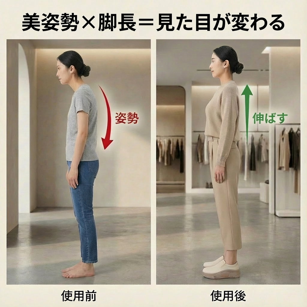 クッション性に優れた厚底ソールで、自然にスタイルが整い、長時間歩いても快適な履き心地です。